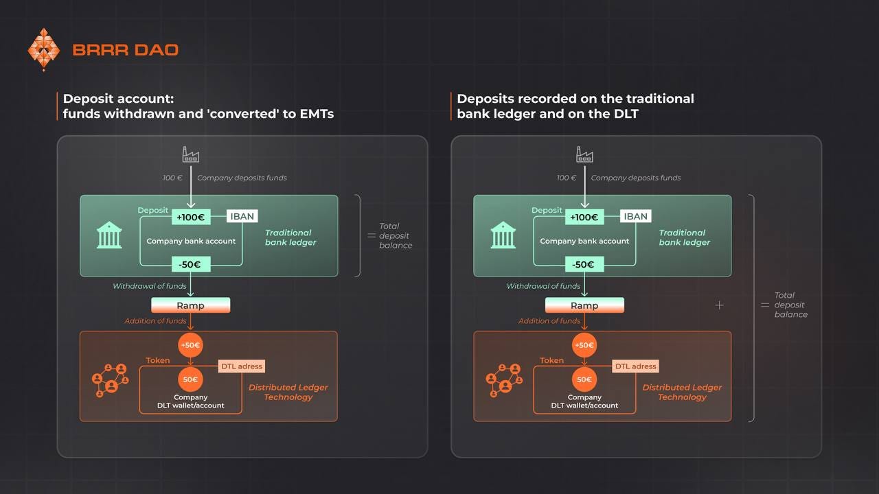 The next critically important aspect: with simple tokenization, the bank account and DLT (blockchain) account are separate. With tokenized deposits, they’re unified into a single account (as confirmed by EBA research). They can also include deposit insurance - impossible with stablecoins, and requiring traditional banking infrastructure participation for CBDCs.